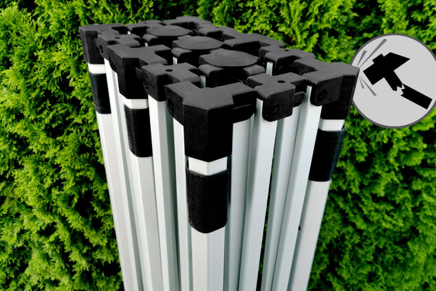 Den snabba fällmekanismen gör att du kan skapa ett generöst övertäckt utrymme för dina varor och kunder på mindre än en minut, helt utan verktyg. Grunden för stabiliteten i detta mobila tält är en robust aluminiumprofil med sexkantigt (hexagonalt) tvärsnitt. Grova fötter längst ner på benen säkerställer pålitlig förankring i marken, medan högkvalitativa skruvförband garanterar smidig hantering och underlättar eventuell service av delar.